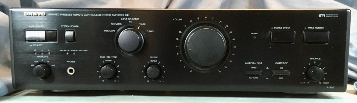 Der Onkyo Stereo Verstärker A-803 wurde von 1991-95 produziert. Ein typischer Verstärker seiner Zeit. Aussergewöhnlich ist der eingebaute Moving Coil Phonoverstärker und die Umschaltung der Lautsprechergruppen über die Fernbedienung.